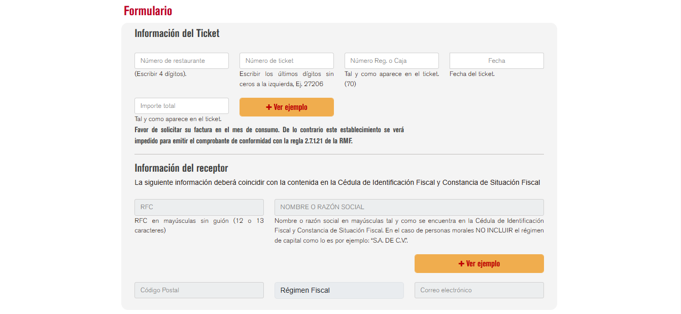 Dentro del formulario encontrarás los campos correspondientes a número de restaurante (4 dígitos), número de ticket (últimos dígitos sin ceros a la izquierda), número de caja (tal como aparece en el ticket), fecha y el importe total exactamente como está impreso. Una vez capturados, selecciona la opción para continuar.