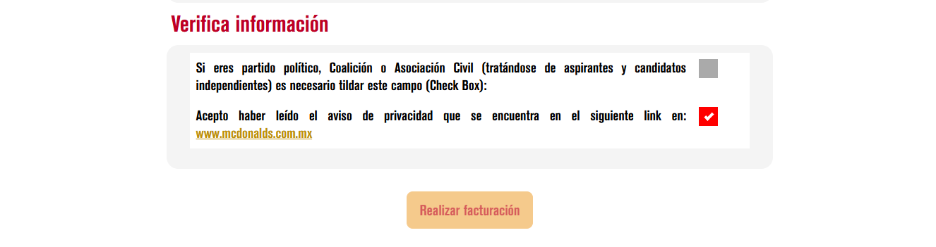 Te permitirá capturar los datos fiscales si no los habías registrado antes, corregirlos en caso de que exista algún error o simplemente aceptarlos si ya aparecen precargados. El RFC debe ir en mayúsculas y sin guiones, además tendrás que confirmar nombre o razón social tal como aparece en la Constancia de Situación Fiscal, código postal, régimen fiscal y correo electrónico, donde recibirás la factura.